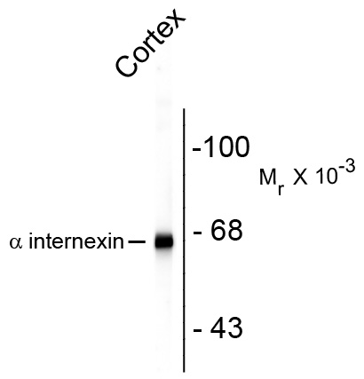 Western blot of rat cortex lysate showing specific immunolabeling of the ~ 66k alpha internexin protein.