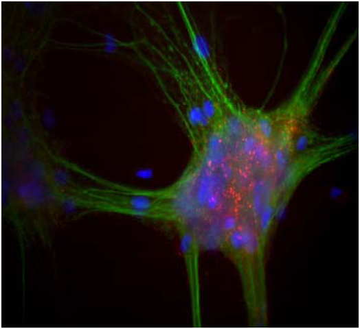 Mixed neuron-glial cultures stained with alpha-synuclein (red) andchicken MAP2 (green). The alpha-synuclein antibody stains vesicular structures, the perikarya and processes of the neurons in this image. |