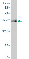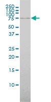 Western Blot analysis of ABCF2 expression in transfected 293T cell line by ABCF2 monoclonal antibody (M01), clone 1D11. Lane 1: ABCF2 transfected lysate(68.53 KDa). Lane 2: Non-transfected lysate. |