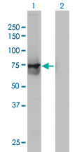 Western Blot analysis of ACOX2 expression in transfected 293T cell line by ACOX2 monoclonal antibody (M01), clone 1D1. Lane 1: ACOX2 transfected lysate(77 KDa). Lane 2: Non-transfected lysate.