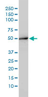 Western Blot analysis of ACY1 expression in transfected 293T cell line by ACY1 monoclonal antibody (M01), clone 4F1-B7. Lane 1: ACY1 transfected lysate(45.9 KDa). Lane 2: Non-transfected lysate. |