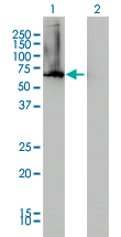 Western Blot analysis of AHCYL1 expression in transfected 293T cell line by AHCYL1 monoclonal antibody (M05), clone 5D6. Lane 1: AHCYL1 transfected lysate(69 KDa). Lane 2: Non-transfected lysate. |