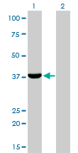 Western Blot analysis of AKR1C4 expression in transfected 293T cell line by AKR1C4 monoclonal antibody (M01), clone 2C11. Lane 1: AKR1C4 transfected lysate(37.2 KDa). Lane 2: Non-transfected lysate. |