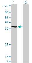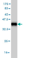 Western Blot analysis of AKR1D1 expression in transfected 293T cell line by AKR1D1 monoclonal antibody (M03), clone 1C2. Lane 1: AKR1D1 transfected lysate(37.4 KDa). Lane 2: Non-transfected lysate.