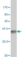 Western Blot analysis of ALAS2 expression in transfected 293T cell line by ALAS2 monoclonal antibody (M01), clone 6C1. Lane 1: ALAS2 transfected lysate(64 KDa). Lane 2: Non-transfected lysate. |