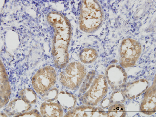 Immunoperoxidase of monoclonal antibody to ALDH1L1 on formalin-fixed paraffin-embedded human kidney. [antibody concentration 3 ug/ml] |