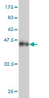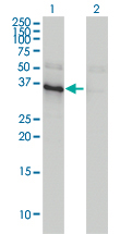 Western Blot analysis of ANKRA2 expression in transfected 293T cell line by ANKRA2 monoclonal antibody (M01), clone 1D11. Lane 1: ANKRA2 transfected lysate(34 KDa). Lane 2: Non-transfected lysate. |