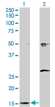 Western Blot analysis of AP2S1 expression in transfected 293T cell line by AP2S1 monoclonal antibody (M01), clone 3E4. Lane 1: AP2S1 transfected lysate(17 KDa). Lane 2: Non-transfected lysate.