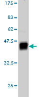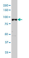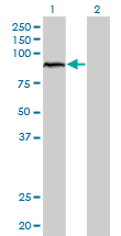 Western Blot analysis of ARNT expression in transfected 293T cell line by ARNT monoclonal antibody (M01), clone 3D10. Lane 1: ARNT transfected lysate(86.6 KDa). Lane 2: Non-transfected lysate. |
