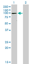 Western Blot analysis of ATP2A1 expression in transfected 293T cell line by ATP2A1 monoclonal antibody (M01), clone 1B11. Lane 1: ATP2A1 transfected lysate(109.3 KDa). Lane 2: Non-transfected lysate. |