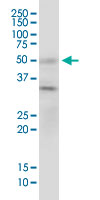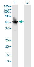 Western Blot analysis of BAG5 expression in transfected 293T cell line by BAG5 monoclonal antibody (M01), clone 2E2. Lane 1: BAG5 transfected lysate (Predicted MW: 51.2 KDa). Lane 2: Non-transfected lysate. |