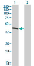 Western Blot analysis of BCS1L expression in transfected 293T cell line by BCS1L monoclonal antibody (M01), clone 5F3. Lane 1: BCS1L transfected lysate(47.534 KDa). Lane 2: Non-transfected lysate. |