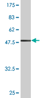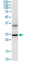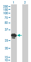 Western Blot analysis of BDNF expression in transfected 293T cell line by BDNF monoclonal antibody (M02), clone 1B10. Lane 1: BDNF transfected lysate(28.9 KDa). Lane 2: Non-transfected lysate. |