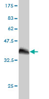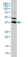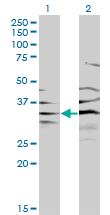 Western Blot analysis of BPNT1 expression in transfected 293T cell line by BPNT1 monoclonal antibody (M01), clone 2E1. Lane 1: BPNT1 transfected lysate(28.1 KDa). Lane 2: Non-transfected lysate. |