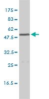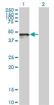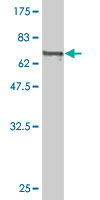 Western Blot analysis of CALR expression in transfected 293T cell line by CALR monoclonal antibody (M01), clone 1G11-1A9. Lane 1: CALR transfected lysate(48 KDa). Lane 2: Non-transfected lysate. |