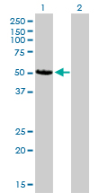 Western Blot analysis of CAMK2D expression in transfected 293T cell line by CAMK2D monoclonal antibody (M02), clone 1A8. Lane 1: CAMK2D transfected lysate(54.1 KDa). Lane 2: Non-transfected lysate.
