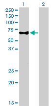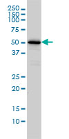 Western Blot analysis of CAMKK1 expression in transfected 293T cell line by CAMKK1 monoclonal antibody (M01), clone 1F6. Lane 1: CAMKK1 transfected lysate(57.31 KDa). Lane 2: Non-transfected lysate. |