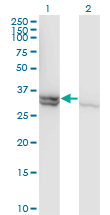 Western Blot analysis of CASP1 expression in transfected 293T cell line by CASP1 monoclonal antibody (M01), clone 3D2. Lane 1: CASP1 transfected lysate(35 KDa). Lane 2: Non-transfected lysate.