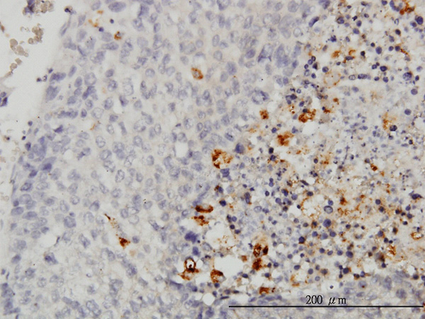 Immunoperoxidase of monoclonal antibody to CASP1 on formalin-fixed paraffin-embedded human hepatocellular carcinoma. [antibody concentration 3 ug/ml] |