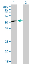 Western Blot analysis of CCT6B expression in transfected 293T cell line by CCT6B monoclonal antibody (M01), clone 1A4. Lane 1: CCT6B transfected lysate(57.8 KDa). Lane 2: Non-transfected lysate. |