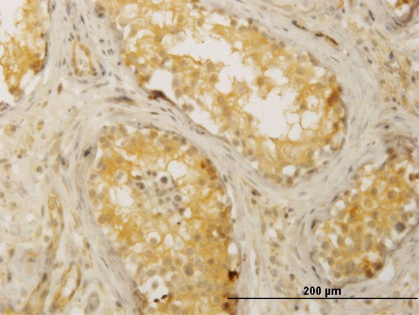 Immunoperoxidase of monoclonal antibody to CDC42BPB on formalin-fixed paraffin-embedded human testis. [antibody concentration 3 ug/ml] |