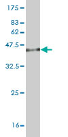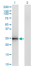 Western Blot analysis of CIDEB expression in transfected 293T cell line by CIDEB monoclonal antibody (M01), clone 2A10. Lane 1: CIDEB transfected lysate(24.7 KDa). Lane 2: Non-transfected lysate. |