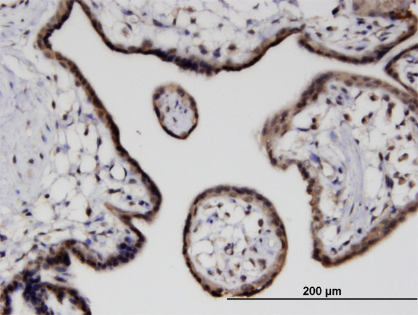 Immunoperoxidase of monoclonal antibody to CITED4 on formalin-fixed paraffin-embedded human placenta. [antibody concentration 3 ug/ml] |