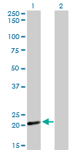 Western Blot analysis of COX4I2 expression in transfected 293T cell line by COX4I2 monoclonal antibody (M01), clone 1F2. Lane 1: COX4I2 transfected lysate(20 KDa). Lane 2: Non-transfected lysate.