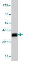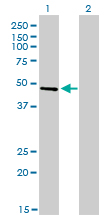Western Blot analysis of CREB3 expression in transfected 293T cell line by CREB3 monoclonal antibody (M01), clone 3H5. Lane 1: CREB3 transfected lysate(41.4 KDa). Lane 2: Non-transfected lysate.