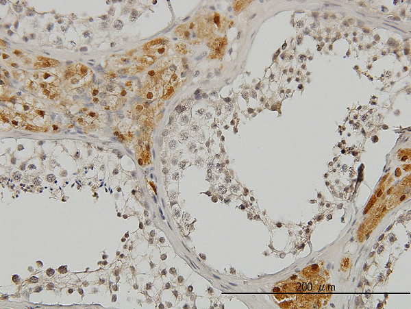 Immunoperoxidase of monoclonal antibody to CREB3 on formalin-fixed paraffin-embedded human testis. [antibody concentration 3 ug/ml] |