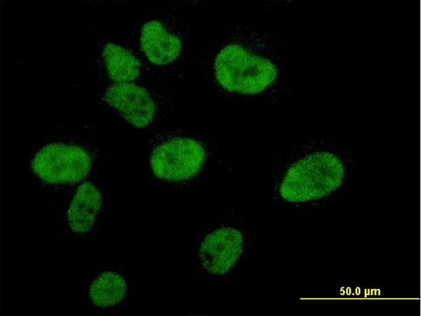 Immunofluorescence of monoclonal antibody to CREBBP on HeLa cell . [antibody concentration 10 ug/ml]