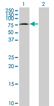 Western Blot analysis of CRSP7 expression in transfected 293T cell line by CRSP7 monoclonal antibody (M06), clone 2G10. Lane 1: CRSP7 transfected lysate(65.446 KDa). Lane 2: Non-transfected lysate.
