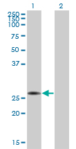 Western Blot analysis of CRSP9 expression in transfected 293T cell line by CRSP9 monoclonal antibody (M01), clone 3E7. Lane 1: CRSP9 transfected lysate(27.2 KDa). Lane 2: Non-transfected lysate. |