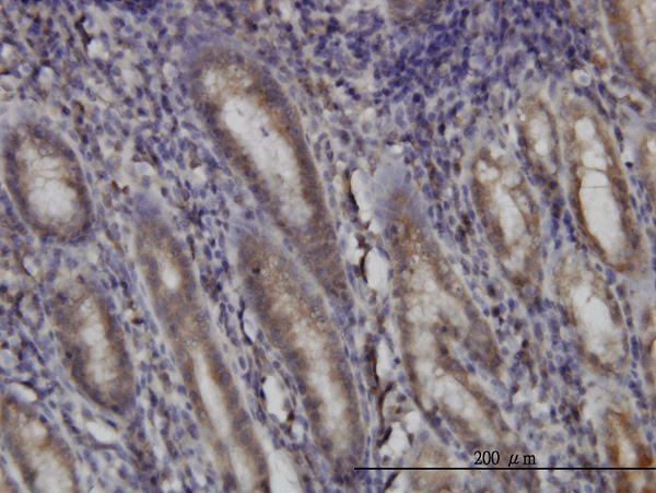 Immunoperoxidase of monoclonal antibody to DHODH on formalin-fixed paraffin-embedded human stomach. [antibody concentration 3 ug/ml] |