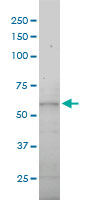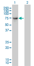 Western Blot analysis of DNAI2 expression in transfected 293T cell line by DNAI2 monoclonal antibody (M01), clone 1C8. Lane 1: DNAI2 transfected lysate(67 KDa). Lane 2: Non-transfected lysate. |