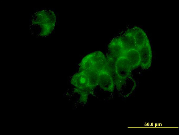 Immunofluorescence of monoclonal antibody to DNPEP on MCF-7 cell . [antibody concentration 10 ug/ml] |