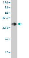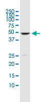 Western Blot analysis of DUSP5 expression in transfected 293T cell line by DUSP5 monoclonal antibody (M04), clone 2F3. Lane 1: DUSP5 transfected lysate (Predicted MW: 42.1 KDa). Lane 2: Non-transfected lysate. |