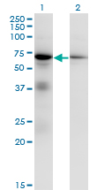 Western Blot analysis of EIF2AK2 expression in transfected 293T cell line by EIF2AK2 monoclonal antibody (M01), clone 1B9. Lane 1: EIF2AK2 transfected lysate(62.1 KDa). Lane 2: Non-transfected lysate. |