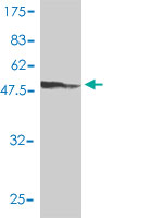 Western Blot analysis of ETV4 expression in transfected 293T cell line by ETV4 monoclonal antibody (M01), clone 3G9-1B9. Lane 1: ETV4 transfected lysate(54 KDa). Lane 2: Non-transfected lysate.