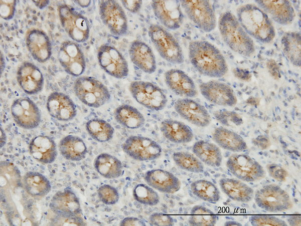Immunoperoxidase of monoclonal antibody to EXOC7 on formalin-fixed paraffin-embedded human small Intestine. [antibody concentration 3 ug/ml] |