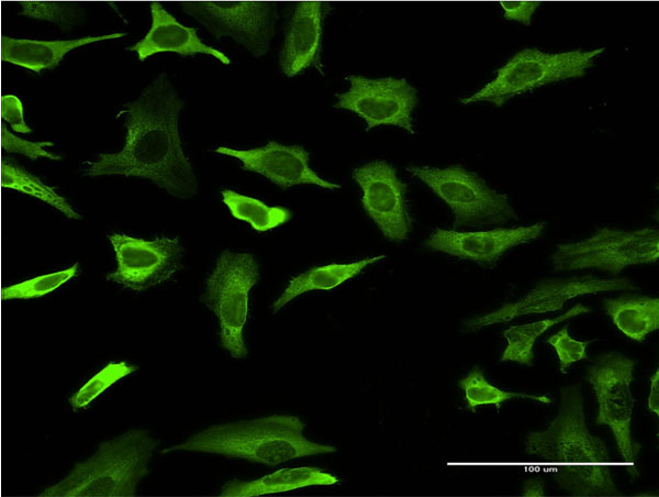 Immunofluorescence of monoclonal antibody to FABP4 on HeLa cell . [antibody concentration 10 ug/ml] |