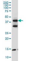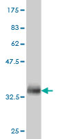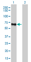 Western Blot analysis of FBLIM1 expression in transfected 293T cell line by FBLIM1 monoclonal antibody (M10), clone 5E11. Lane 1: FBLIM1 transfected lysate(41 KDa). Lane 2: Non-transfected lysate. |