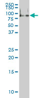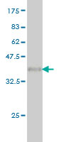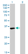 Western Blot analysis of FMR1 expression in transfected 293T cell line by FMR1 monoclonal antibody (M01), clone 2D4. Lane 1: FMR1 transfected lysate(34.1 KDa). Lane 2: Non-transfected lysate. |