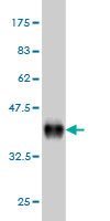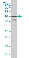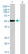 Western Blot analysis of FOXA2 expression in transfected 293T cell line by FOXA2 monoclonal antibody (M01), clone 7E6. Lane 1: FOXA2 transfected lysate(48.3 KDa). Lane 2: Non-transfected lysate. |