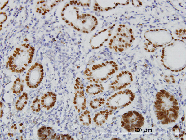 Immunoperoxidase of monoclonal antibody to FOXA2 on formalin-fixed paraffin-embedded human stomach. [antibody concentration 1 ug/ml] |