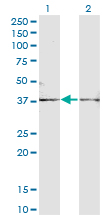 Western Blot analysis of FST expression in transfected 293T cell line by FST monoclonal antibody (M01A), clone 1G4. Lane 1: FST transfected lysate (Predicted MW: 38 KDa). Lane 2: Non-transfected lysate. |