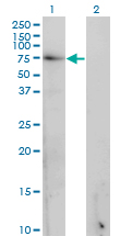 Western Blot analysis of GAD1 expression in transfected 293T cell line by GAD1 monoclonal antibody (M02), clone 5E11. Lane 1: GAD1 transfected lysate(66.9 KDa). Lane 2: Non-transfected lysate. |