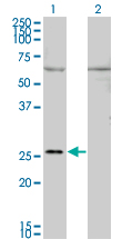 Western Blot analysis of GAP43 expression in transfected 293T cell line by GAP43 monoclonal antibody (M01), clone 3C11. Lane 1: GAP43 transfected lysate(24.8 KDa). Lane 2: Non-transfected lysate.