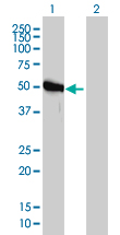 Western Blot analysis of GART expression in transfected 293T cell line by GART monoclonal antibody (M01), clone 4D6-1D5. Lane 1: GART transfected lysate(46 KDa). Lane 2: Non-transfected lysate. |