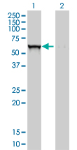 Western Blot analysis of GBA expression in transfected 293T cell line by GBA monoclonal antibody (M01), clone 2E2. Lane 1: GBA transfected lysate(60 KDa). Lane 2: Non-transfected lysate. |